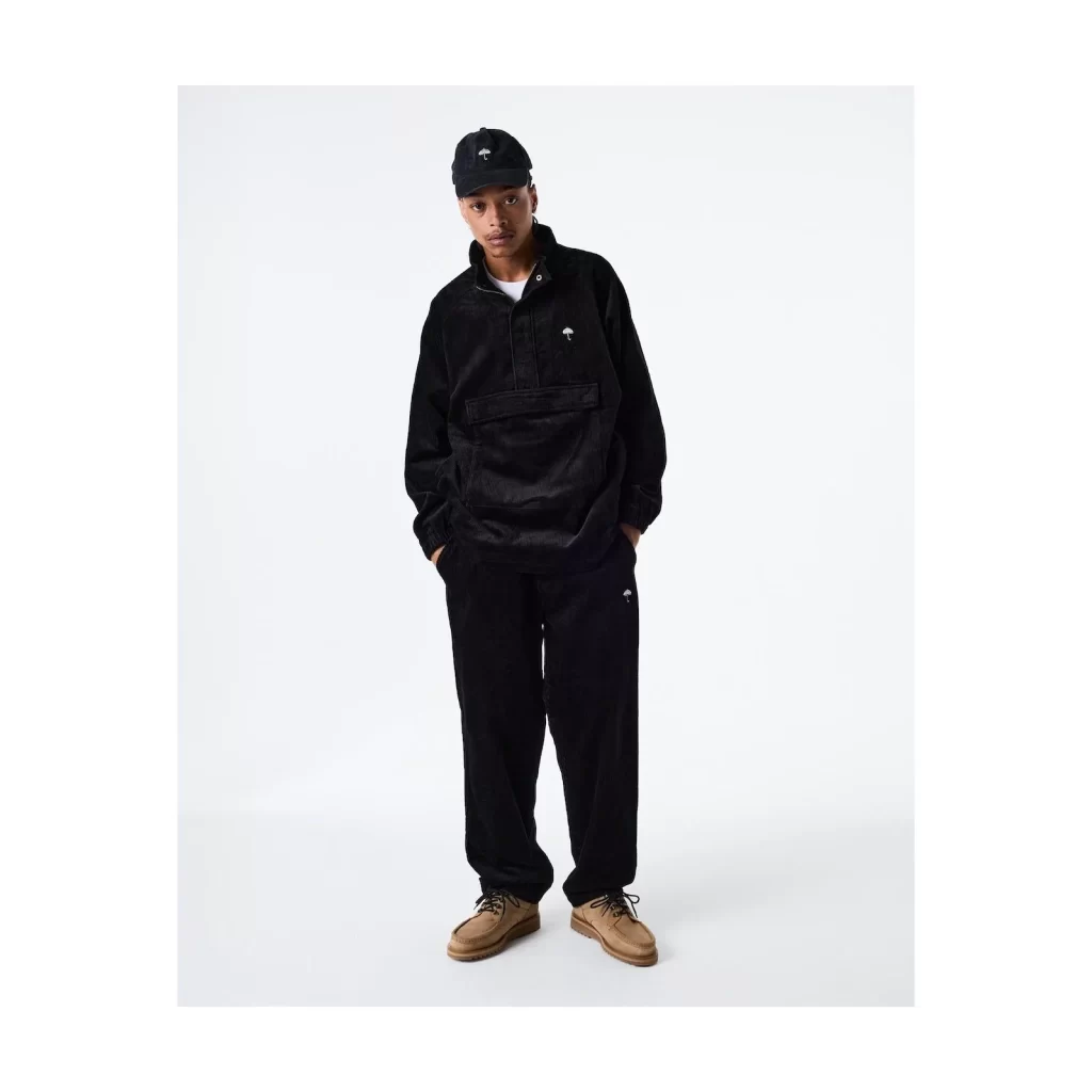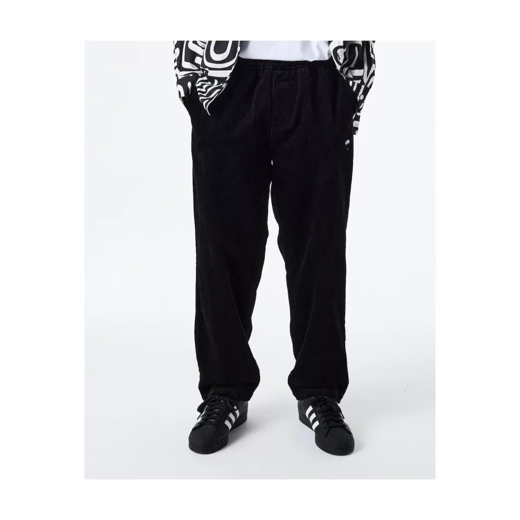 CORDUROY SURFER PANTS WITH EMBROIDERED UMBRELLA AT FRONT SIDE LEG. SIDE AND BACK POCKETS.